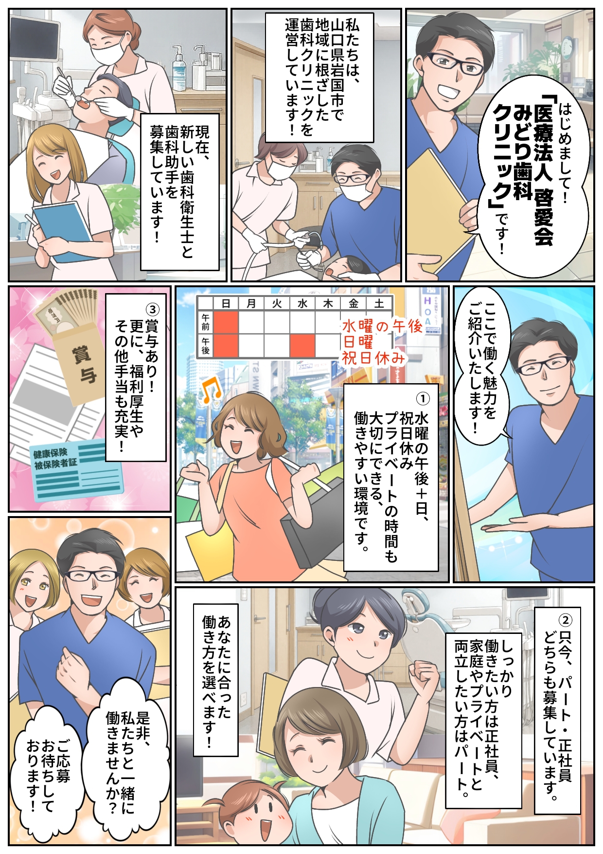 | 給与 | 【歯科衛生士】1350円~ 【歯科助手】1100円~ |